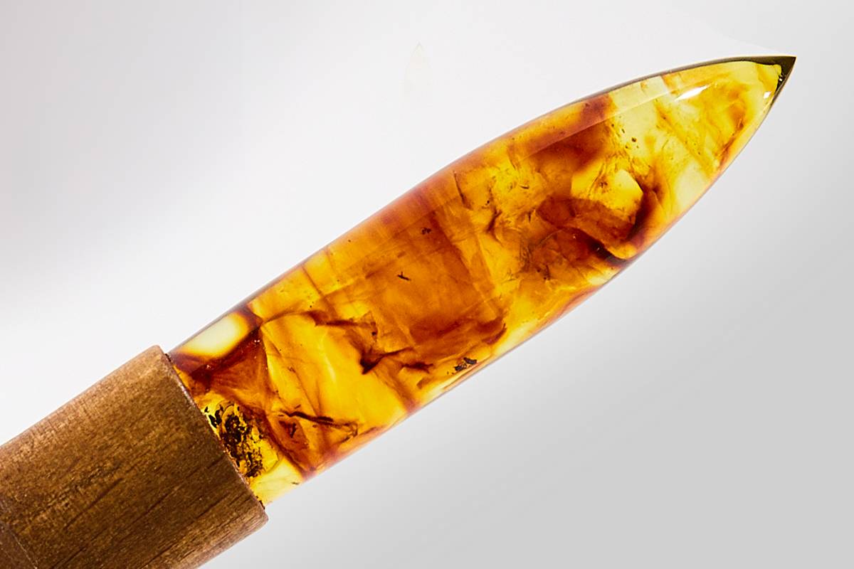 Для производства янтарной пули специалисты применили технологию прессования. Метод позволяет под воздействием давления и температуры соединить отдельные фрагменты самоцвета в единую заготовку. Технологи комбината создали внутри заготовок для пули особый рисунок, комбинируя янтарь различных оттенков и меняя параметры прессования.