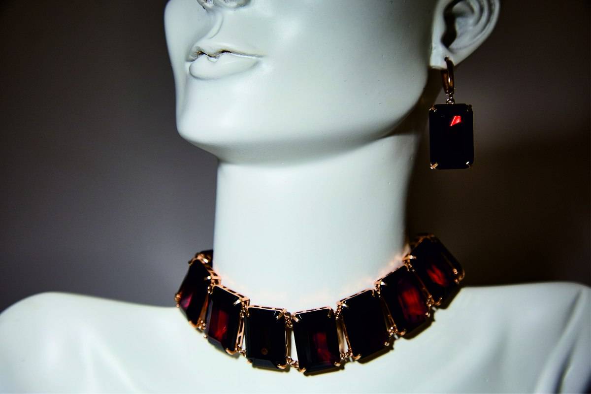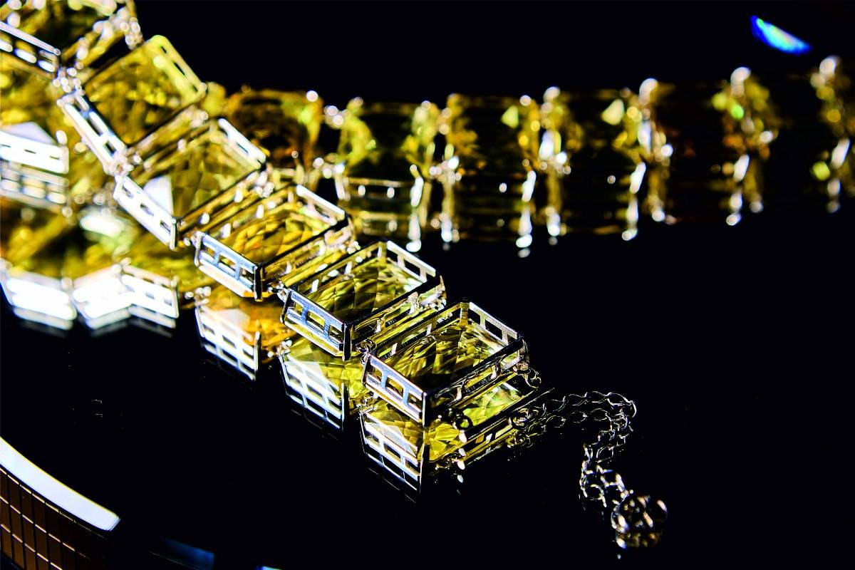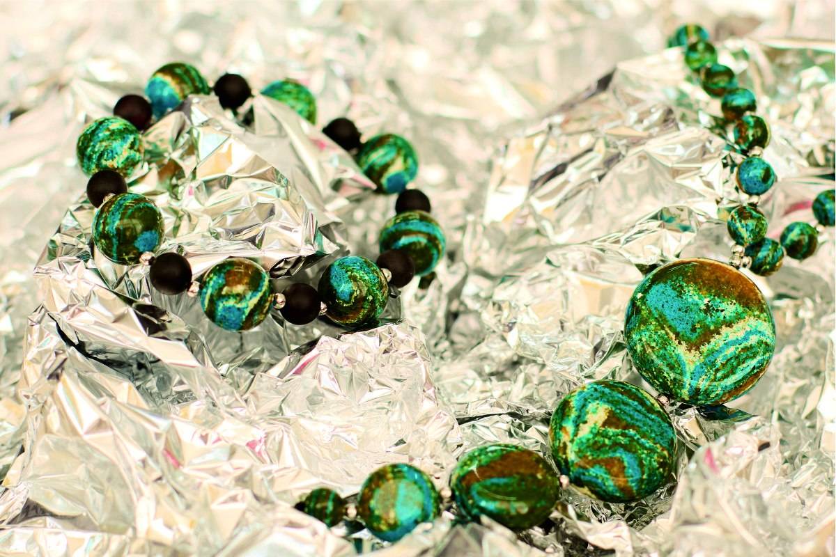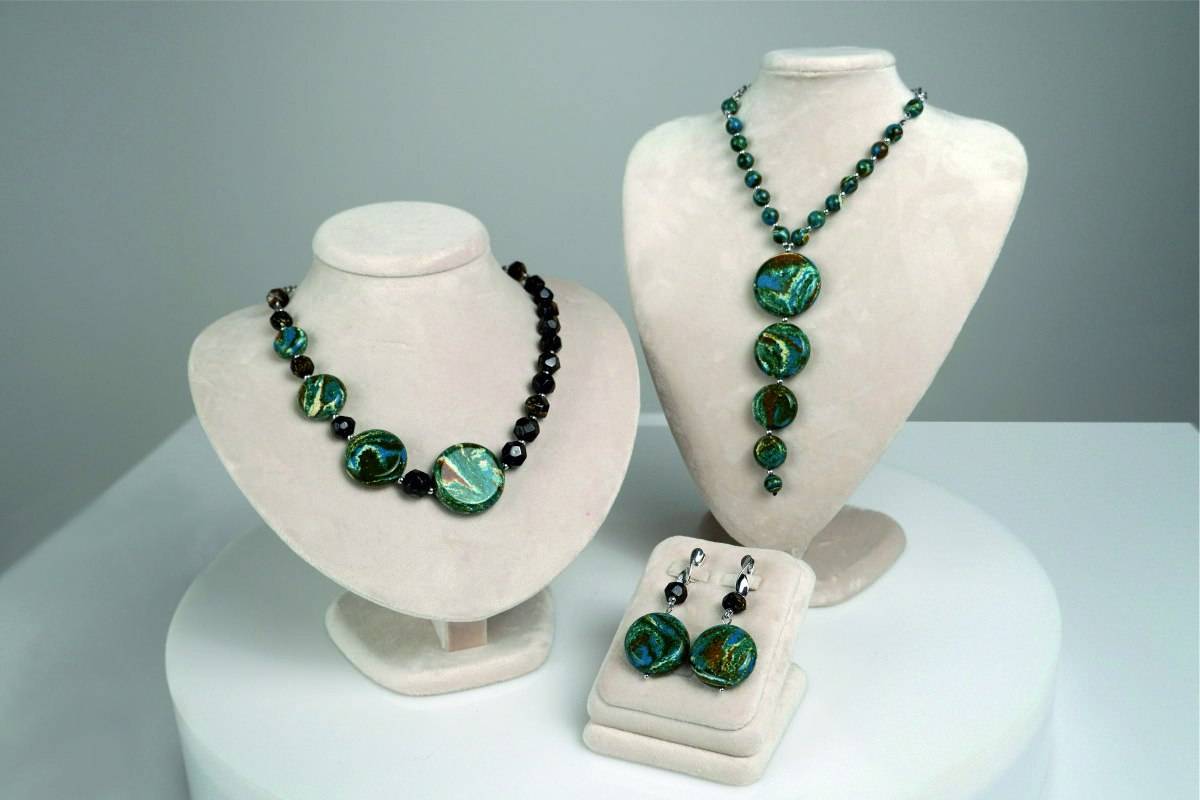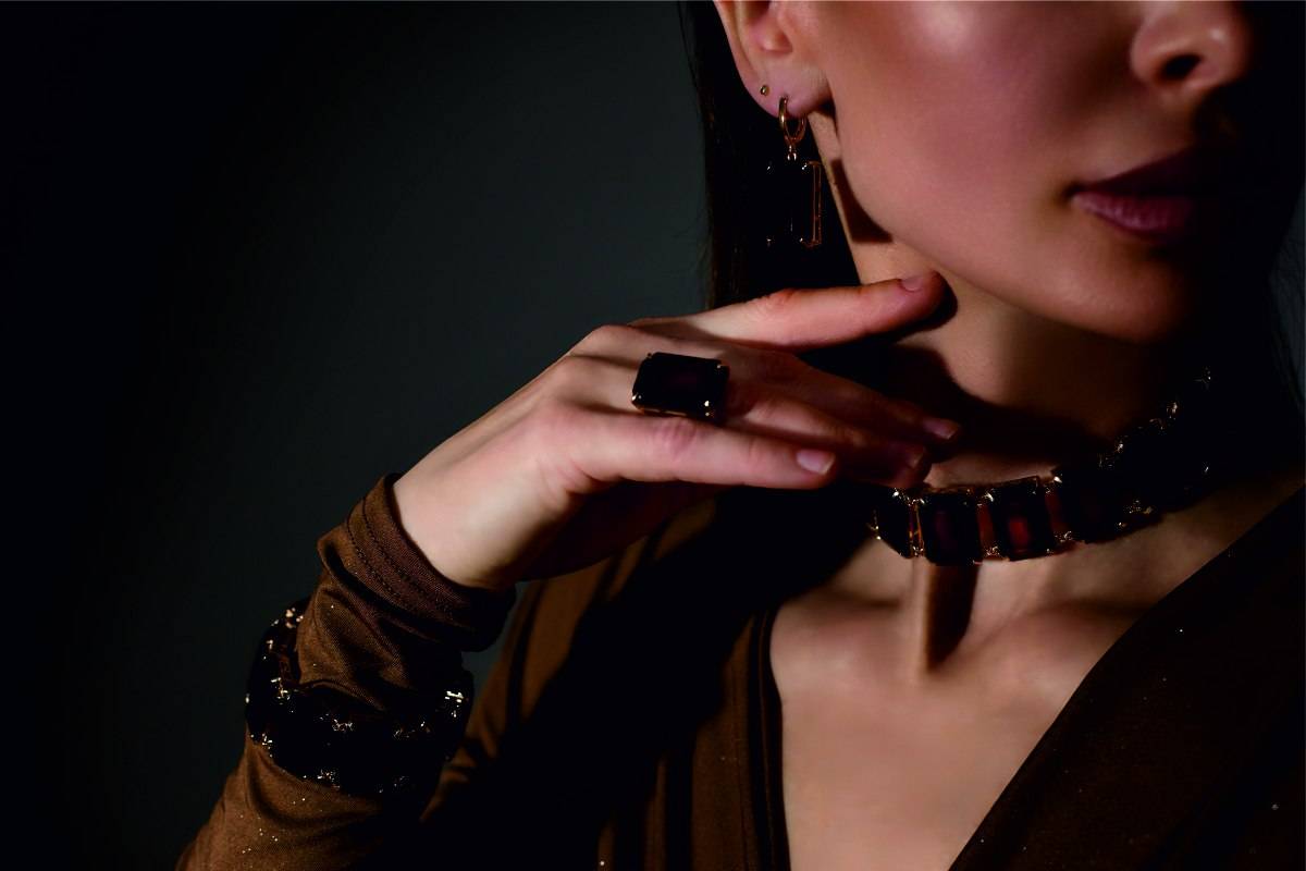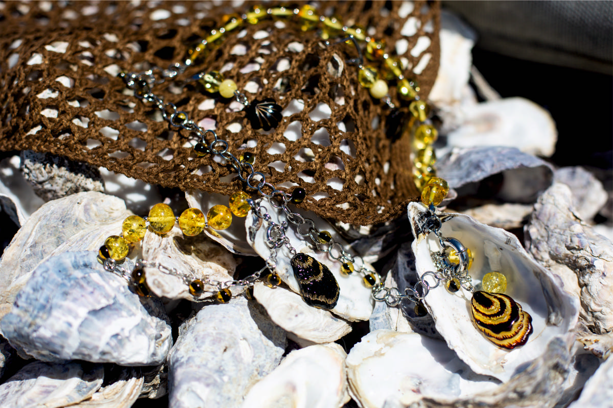 В коллекции серьги, диадемы, колье, чокеры, шпильки и гребни в волосы, браслеты, кольца, бусы, подвески, броши. В украшениях используется прозрачный и пейзажный янтарь – бусины молочного оттенка. Для любительниц ярких образов доступны сеты из всей палитры оттенков тонированного камня, изюминка которой – зеленый янтарь.