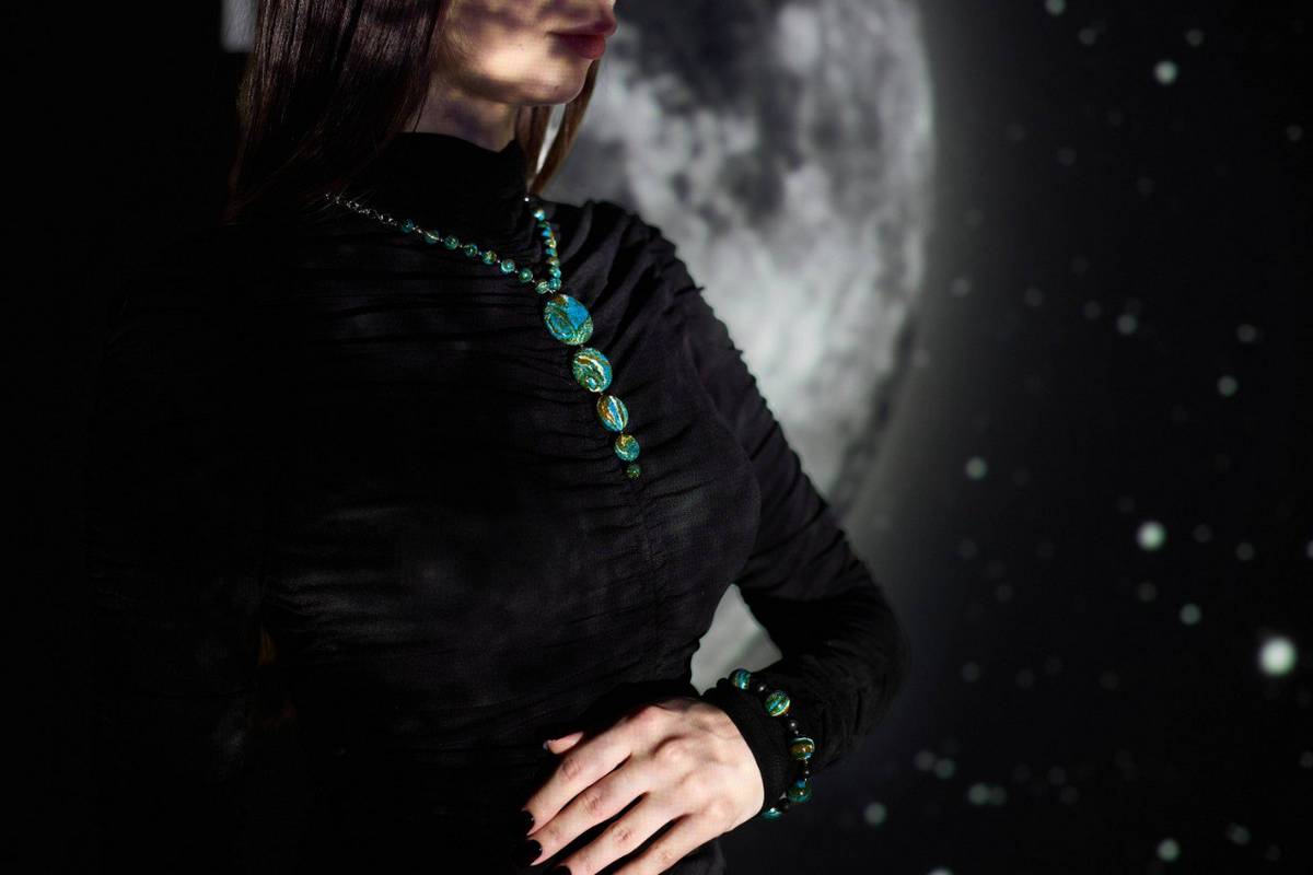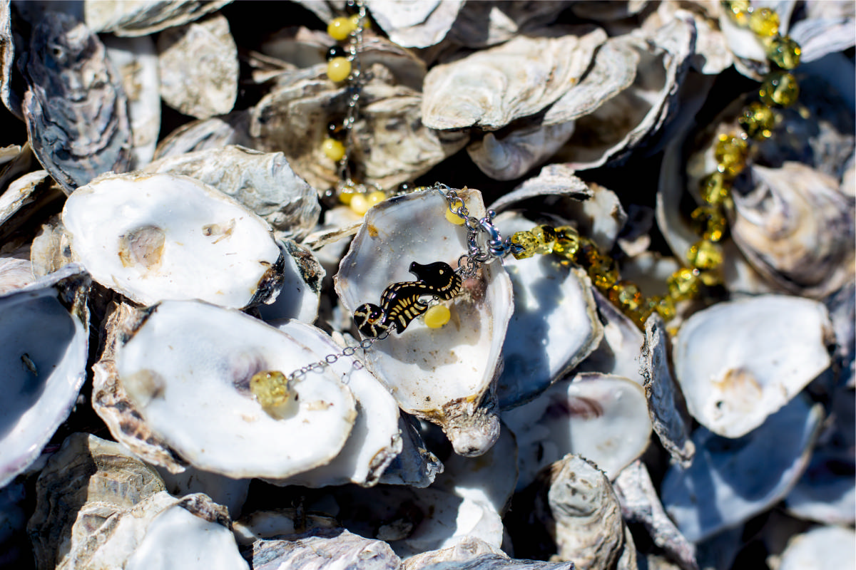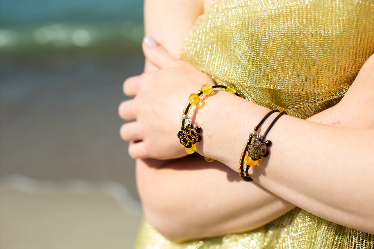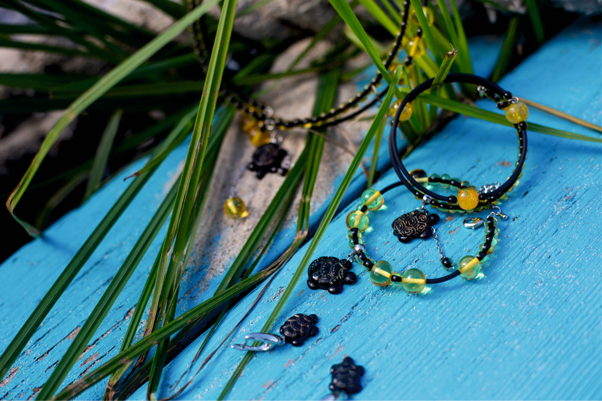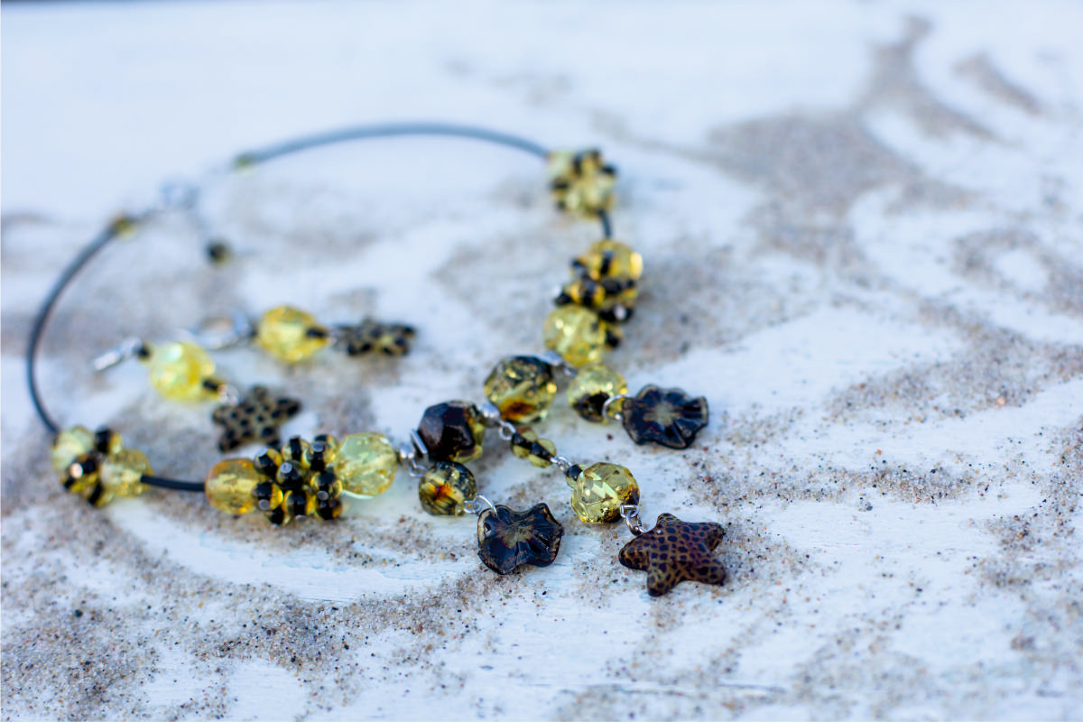 Черепашки, ракушки, морские коньки и звезды с зеленоватым свечением внутри прозрачного камня создают глубокий и таинственный океанический образ. Технология обработки камня «зеленый янтарь» позволяет за счет сочетания черного и природного лимонного оттенка янтаря добиться уникального оттенка без применения каких-либо химических красителей.