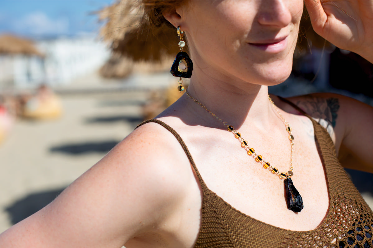 Янтарное кросс-боди можно носить как сотуар – удлиненное женское шейное ожерелье. Металлические кольца позволяют прикрепить к нему подвеску. Допустимо завязать украшение в узел для более делового стиля либо добавить его к неформальному оверзайзу, скрутив в две нитки. Особый шик – перекинуть через плечо по диагонали, как сумочку или использовать его в качестве изящного пояска.